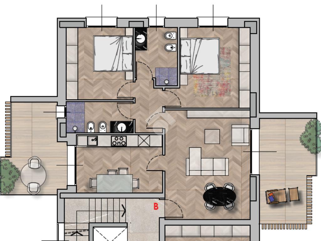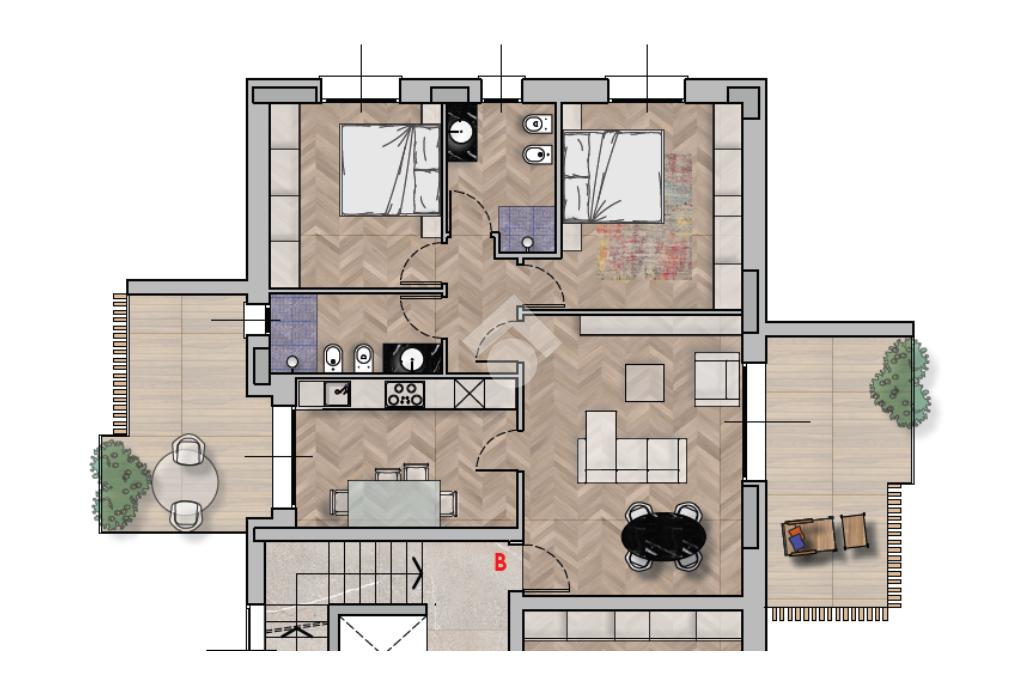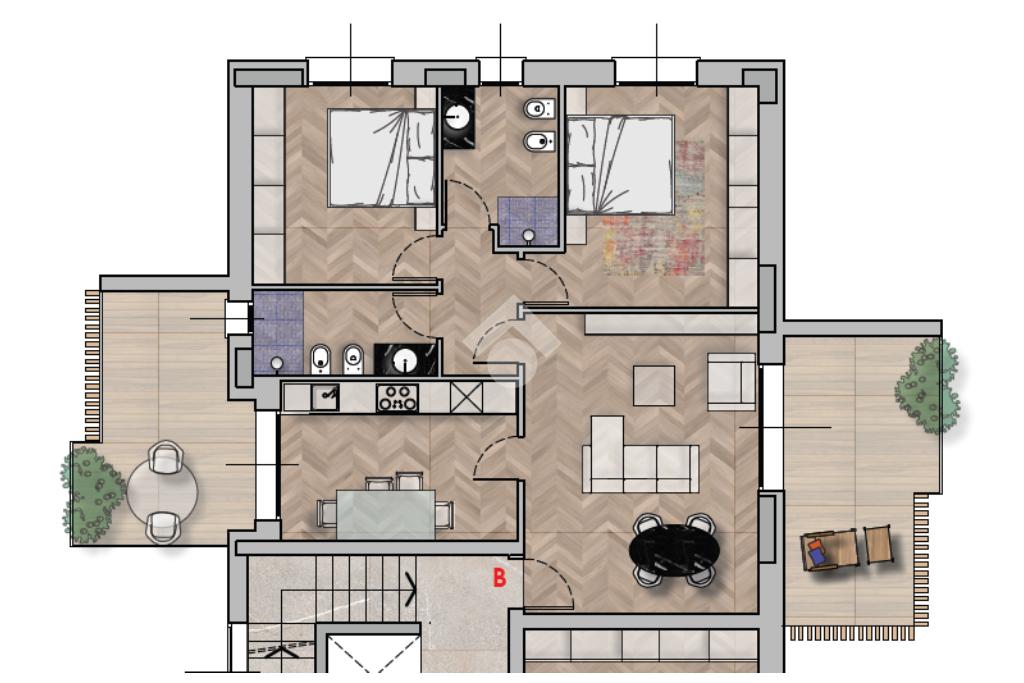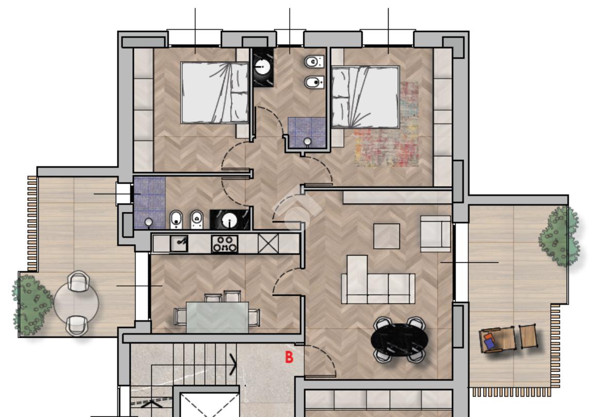 Tutte le abitazioni dispongono di spazi esterni privati, progettati per valorizzare il